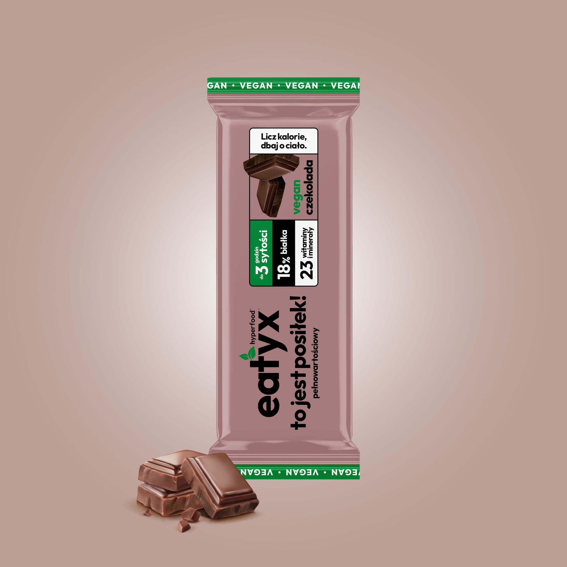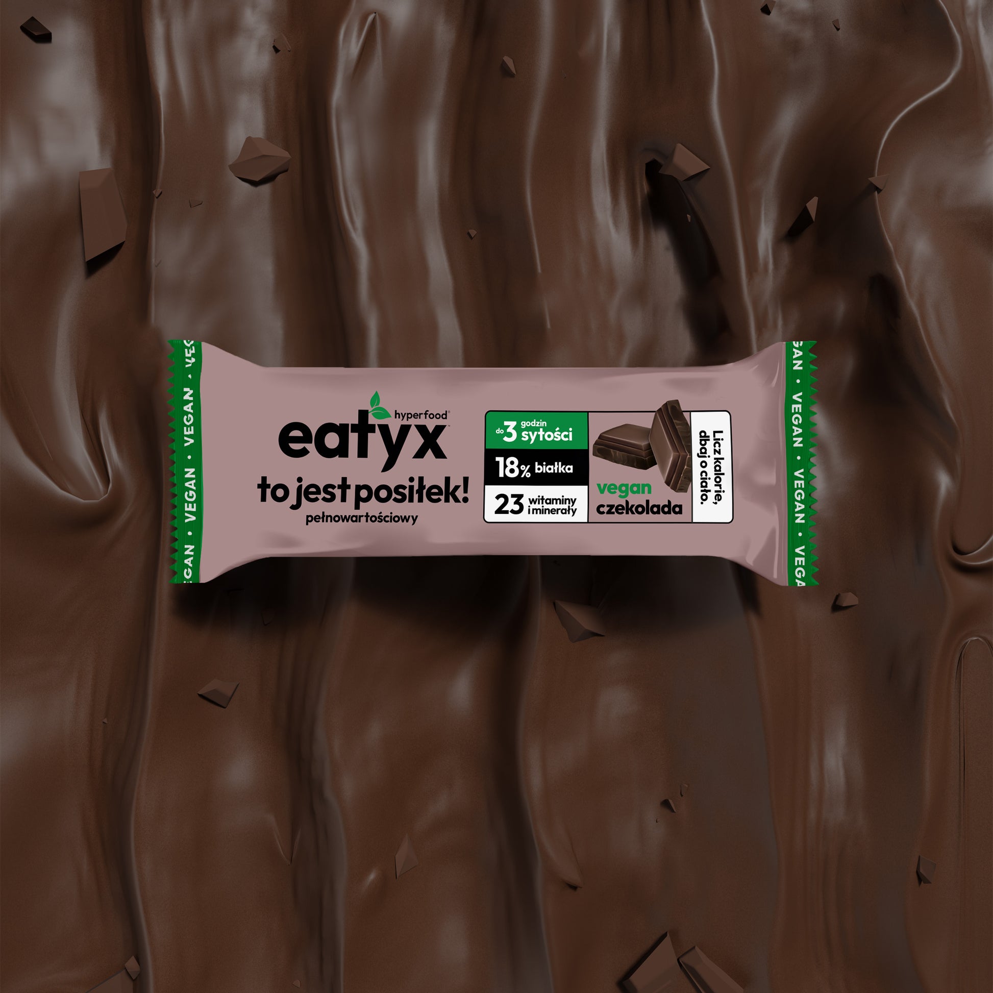 eatyx o smaku czekoladowym to nowoczesny, zdrowy i pełnowartościowy posiłek przyszłości w formie batona, który wspomoże w utrzymaniu wymarzonej sylwetki i kontroli wagi. Można nim zastąpić dowolne danie w ciągu dnia: śniadanie, obiad czy kolację. Starannie opracowany, zbilansowany skład dostarcza tyle samo składników odżywczych, witamin i minerałów, ile tradycyjny posiłek.