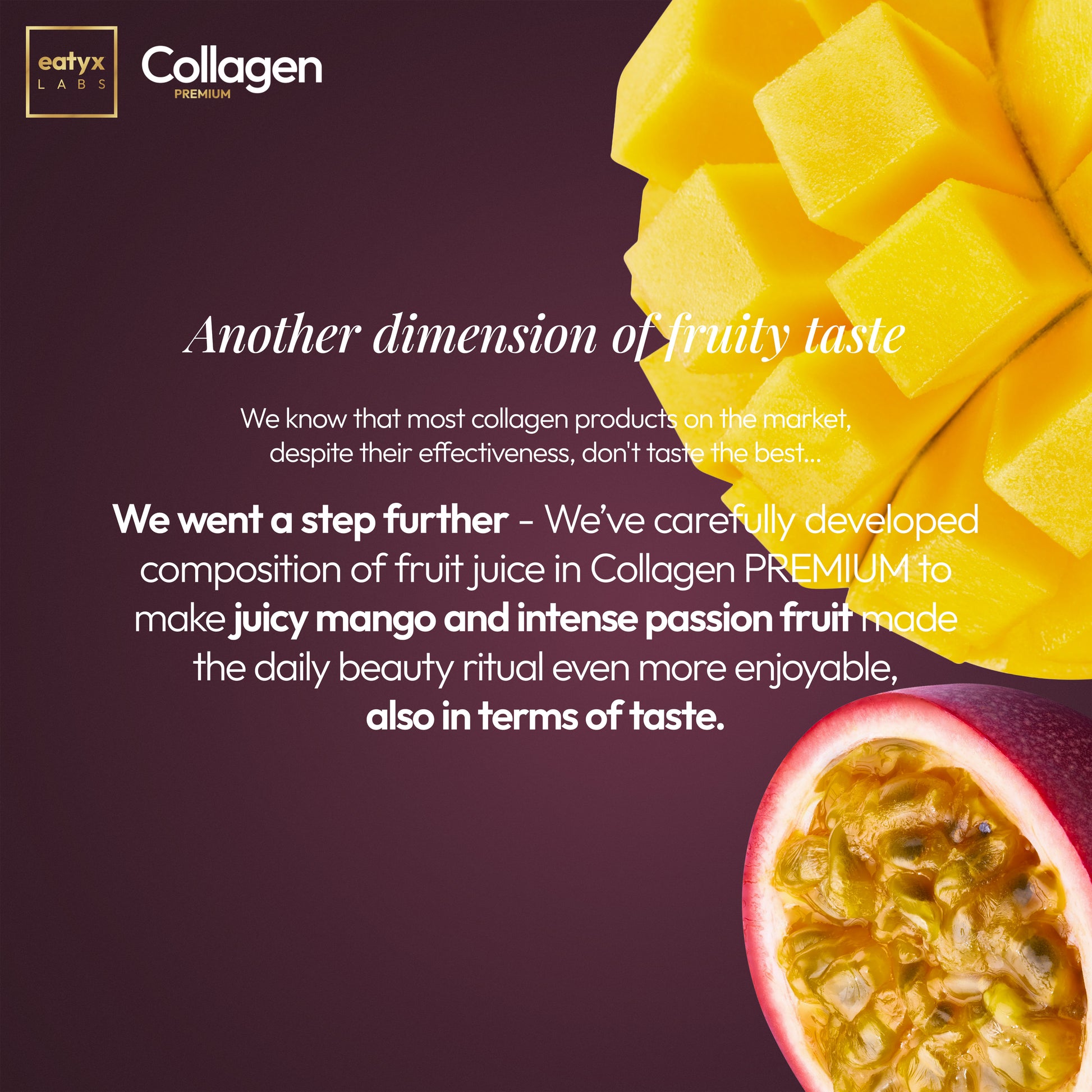 eatyx LABS Collagen Premium 16 000 mg to suplement diety w formie płynu o smaku mango-marakuja. Zawiera wysoką dawkę kolagenu wołowego, wzbogacony o witaminy z grupy B i witaminę C dla synergii działania i holistycznego podejścia.
