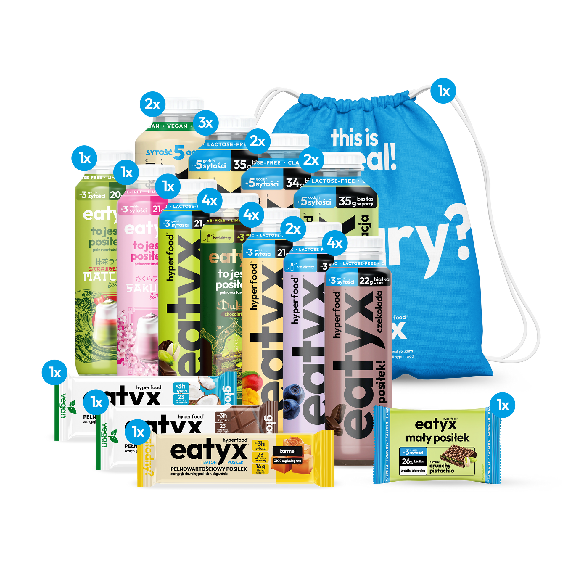 - posiłki w płynie 300 ml (bez laktozy i glutenu): Sakura Latte, Strawberry matcha latte, Dubajska czekolada (4 szt.), Czekolada (4 szt.), Śmietankowa jagoda (2 szt.), Pistacjowa czekolada, Mango (4 szt.),
